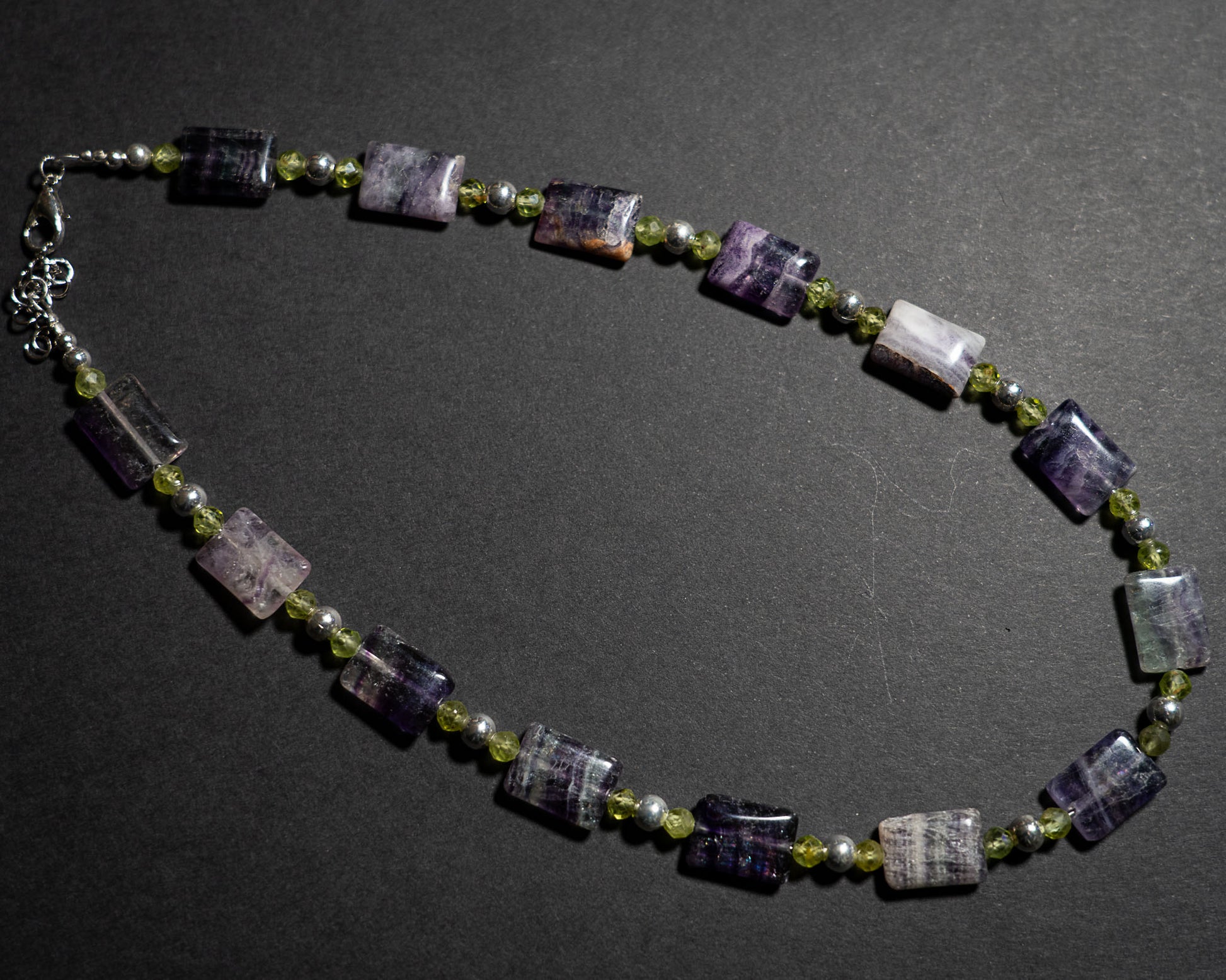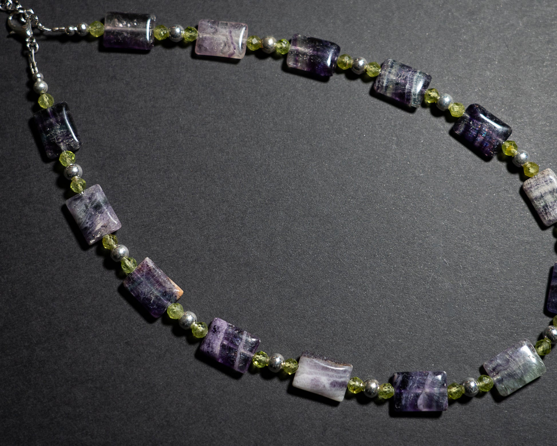 Accentuating the fluorite are round faceted peridot beads, shimmering with a verdant brilliance that adds a refreshing burst of color to the necklace. These peridot beads infuse the piece with a lively energy, reminiscent of sun-drenched meadows and vibrant foliage.